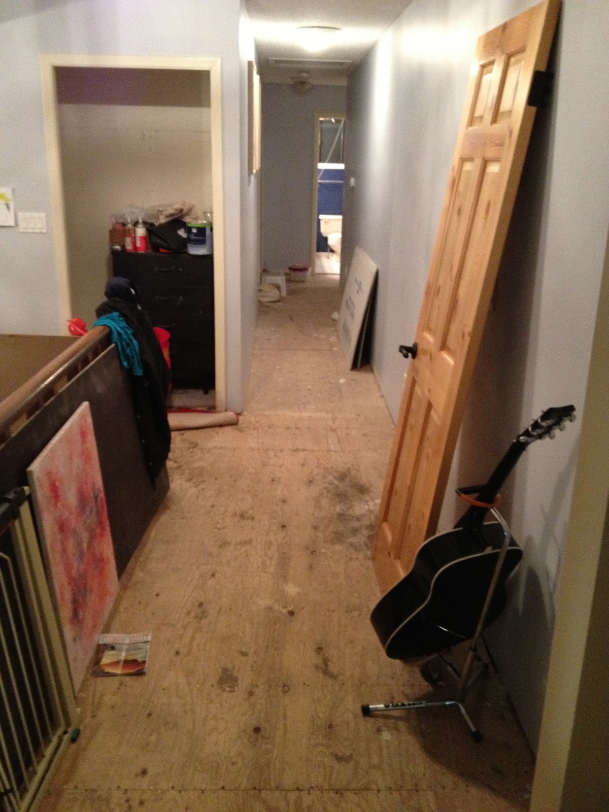 So this is a live chaos progress shot of the floor already having been removed to expose the subfloor in the hallway. That door belongs to the bathroom. I don't know why the guitar and the painting are there, I'm assuming we were ripping up carpet elsewhere and trying to get some space.